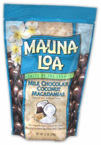 Dry roasted macadama nuts covered in sweet shredded coconut and rich milk chocolate. Large 12-Ounce resealable bag.Mauna Loa Macadamia Nuts, Milk Chocolate Coconut, LARGE 11-Ounce (Resealable Bag) Feature