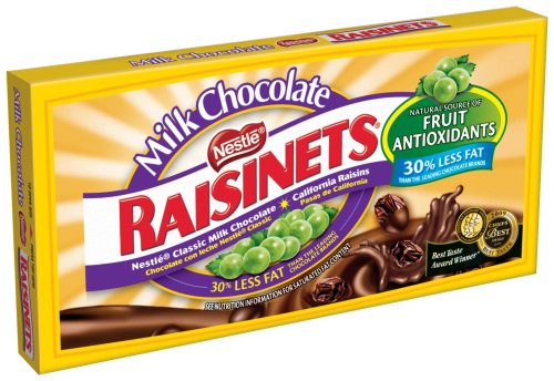 Raisinets milk chocolate, 3.5-ounce boxes (pack of 18) are sun-ripened, plump juicy California raisins tucked in rich creamy Nestlé classic milk chocolate, which is the reason movie-goers have always loved Nestlé Raisinets. But Raisinets aren’t just for the movies anymore! Raisinets are a better-for-you option for on-the-go snacking or an at-home indulgence. Nestlé Raisinets have 30% less fat than leading chocolate brands1 and provide ½ serving of real fruit in every cup.B000V9G1DUASIN