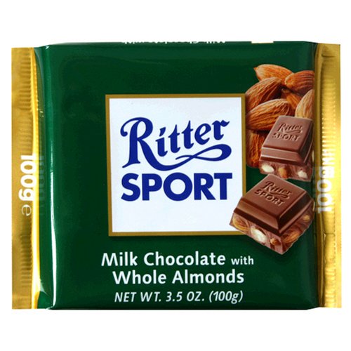 Milk Chocolate with Whole Almonds have been making a commotion since 1983.The reason for this is 23 percent crunchy roasted Californian almonds embedded in 77 percent chocolate. They’re just waiting around to please somebody’s palate. After ripening beneath the Californian sun, ritter sport’s almonds are carefully selected and left in their almond skin. This is just part of the process of perfecting our whole almonds’ taste experience, enhancing the almonds’ full flavor during the roasting process. Later, the almonds combine with the smooth, rich taste of West African cocoa, as well as fine cocoas from Papua New Guinea and Madagascar. The result is that each square of ritter sport whole almonds becomes an unmistakable piece of chocolate pleasure.Ritter Sport, Milk Chocolate with Whole Almonds, 3.5-Ounce Bars (Pack of 11) Feature
