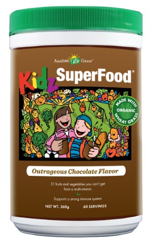 Amazing Grass Kidz SuperFood is Certified Organic. Our new 360gram bottle is a 2 months supply. A nutritional powerhouse that combines 33 rainbow colored fruits and vegetables in a delicious chocolate drink powder. Mix with milk or water. One serving gives you the antioxidant equivalent of 3 servings of fruits and vegetables. Amazing Grass Kidz SuperFood phyto-nutritous fruit and vegetable blend: organic wheat grass, organic barley grass, organic alfalfa, asparagus, lima beans, green peas, kale, kiwi, organic spinach, organic broccoli, brussel sprouts, green beans, zuichini, apricots, organic carrots, mangos, pineapple, sweet potatoes, tangerines, yellow squash, pomegranates, raspberries, guavas, cranberries, red cabbage, cherries, tomatoes, beets, plums, purple grapes, blueberries, organic oat fiber, organic soy milk powder (organic soy beants, organic cane juice), organic cocoa, FOS (from chicory root), butch cocoa, natural vanilla, apple pectin fiber, carrageenan, sea salt, silicon dioxide (anti-caking). Serving size: one scoop, 6 grams. Recommend 1-3 servings daily, for ages 2+.Amazing Grass Kidz SuperFood Powder, Outrageous Chocolate Flavor, 60 Servings, 360-Gram Container Feature